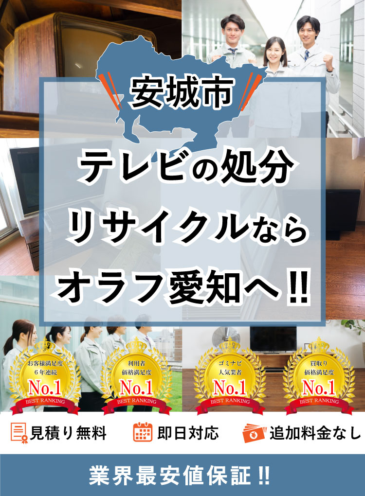 安城市でテレビの処分ならオラフグループにお任せ下さい!地域最安値の料金で不要になったテレビを処分します。リサイクル出来るテレビは買取りもOK!お部屋からの搬出作業は無料で対応します。お見積もりは24時間365日無料で受付中。