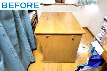 2人でも使えそうな大きな学習机をお引き取りさせていただきました。横幅は160近くありそうな大きなタイプでしたのでそのままの状態ですとお部屋から搬出作業が出来ず、お部屋内部で解体してから処分させていただきました。