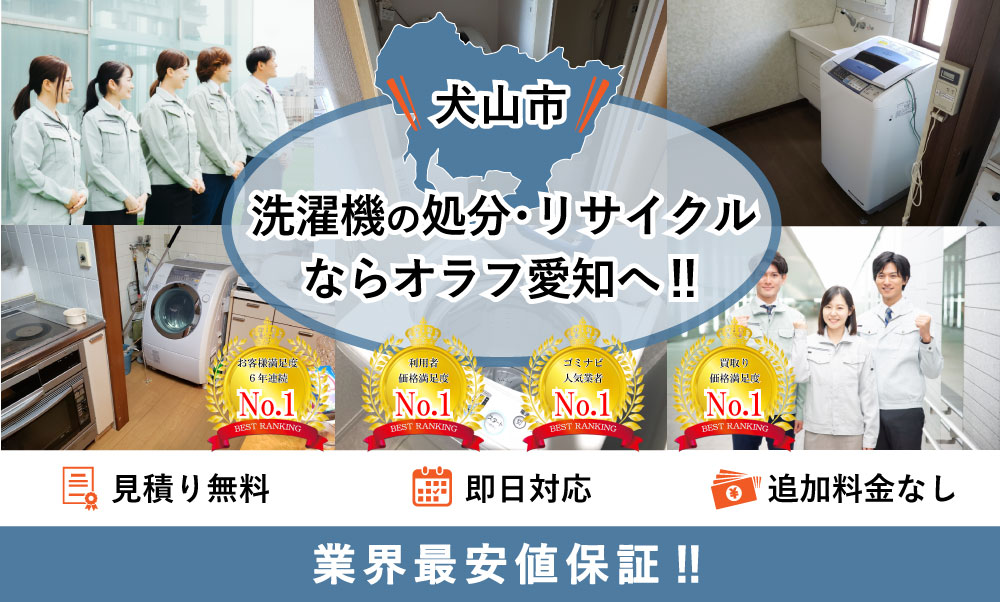 犬山市で洗濯機の処分ならオラフグループにお任せ下さい!地域最安値の料金で不要になった洗濯機を処分します。リサイクル出来る洗濯機は買取りもOK!取外しや搬出作業は当社のプロスタッフが無料で対応します。お見積もりは24時間365日無料で受付中。