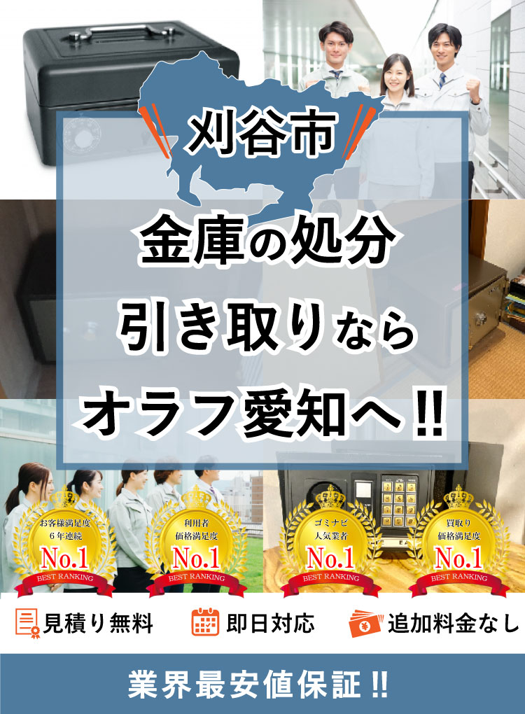 刈谷市で金庫の処分ならオラフグループにお任せ下さい!地域最安値の料金で使わなくなった金庫を処分します。金庫の搬出作業は無料で対応します。重くて部屋から出せない金庫でも当社専門のプロスタッフに遠慮なくお任せ下さい!お見積もりは24時間365日無料で受付中。