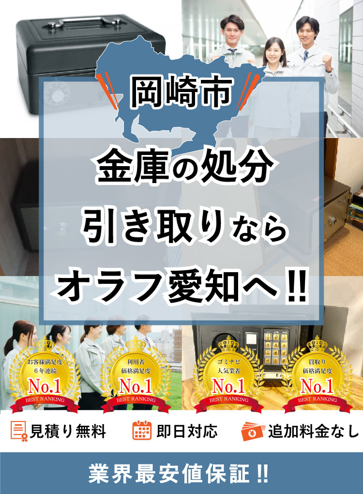 岡崎市で金庫の処分ならオラフグループにお任せ下さい!地域最安値の料金で使わなくなった金庫を処分します。金庫の搬出作業は無料で対応します。重くて部屋から出せない金庫でも当社専門のプロスタッフに遠慮なくお任せ下さい!お見積もりは24時間365日無料で受付中。