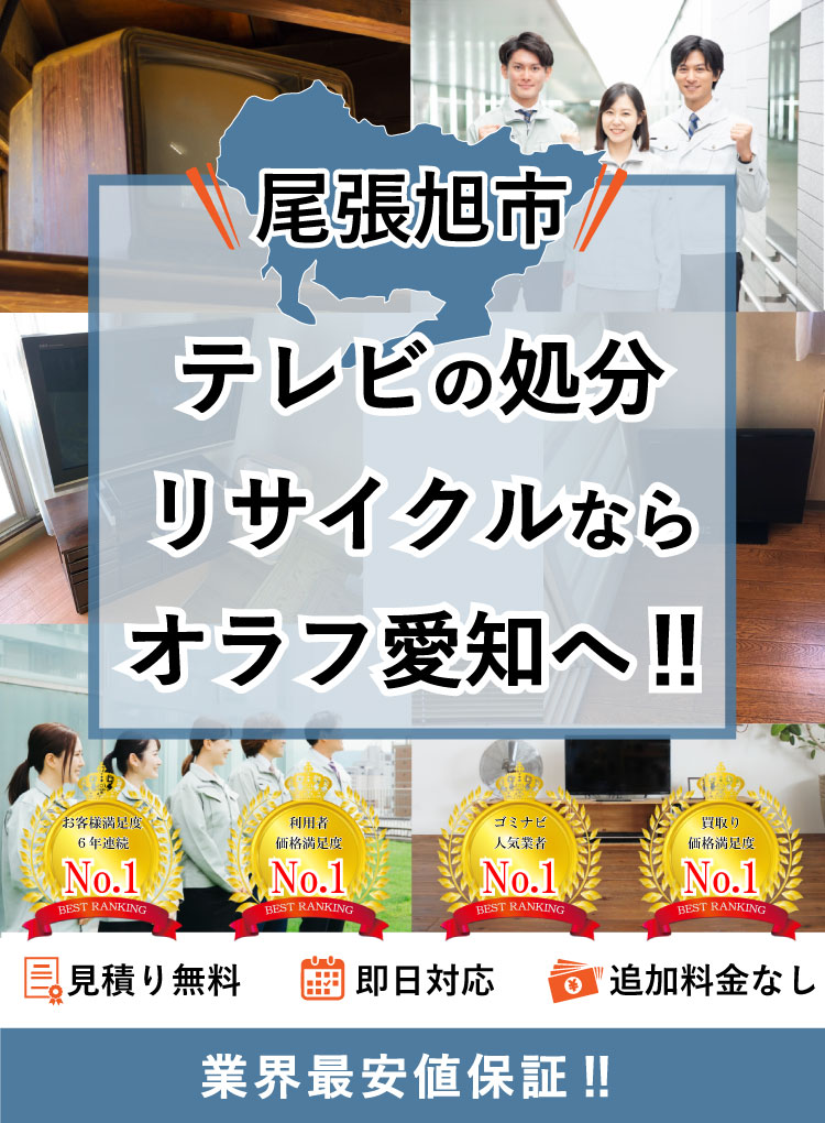 尾張旭市でテレビの処分ならオラフグループにお任せ下さい!地域最安値の料金で不要になったテレビを処分します。リサイクル出来るテレビは買取りもOK!お部屋からの搬出作業は無料で対応します。お見積もりは24時間365日無料で受付中。