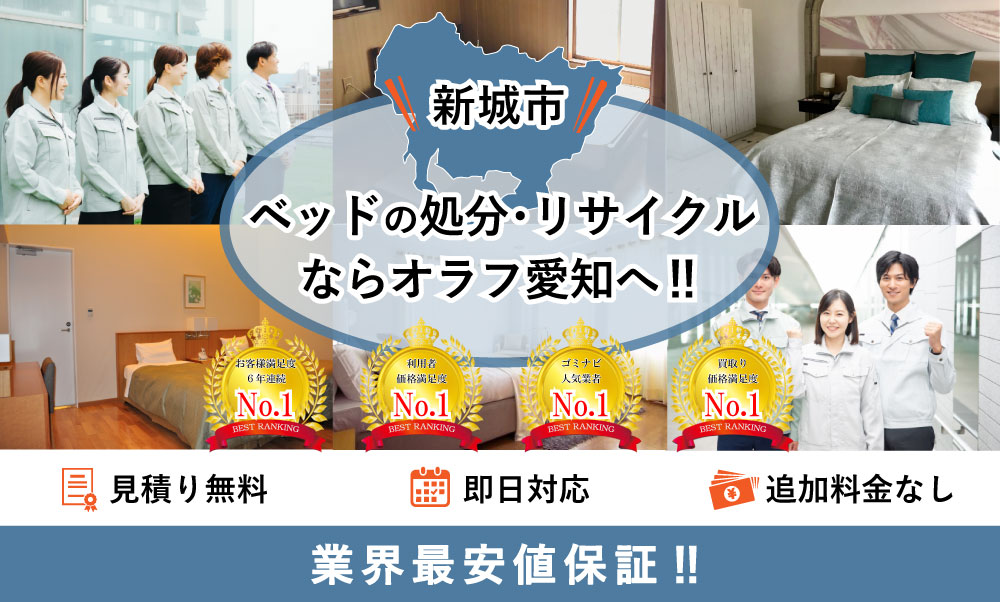新城市でベッド・マットレスの処分ならオラフグループにお任せ下さい!地域最安値の料金で不要になったベッド・マットレスを処分します。リサイクル出来るベッドは買取りもOK!お部屋からの搬出作業は無料で対応します。お見積もりは24時間365日無料で受付中。