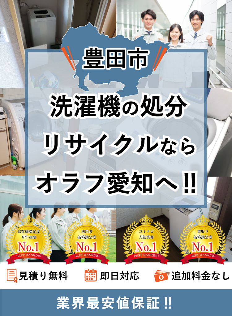 豊田市で洗濯機の処分ならオラフグループにお任せ下さい!地域最安値の料金で不要になった洗濯機を処分します。リサイクル出来る洗濯機は買取りもOK!取外しや搬出作業は当社のプロスタッフが無料で対応します。お見積もりは24時間365日無料で受付中。