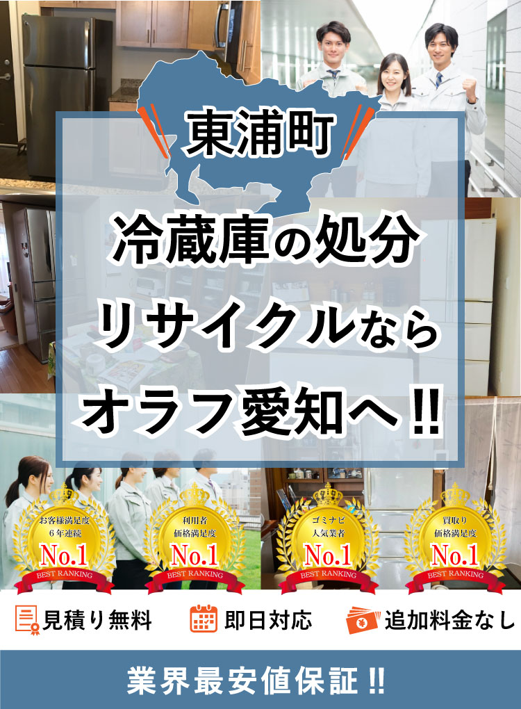 東浦町で冷蔵庫の処分ならオラフグループにお任せ下さい!地域最安値の料金で不要になった冷蔵庫を処分します。リサイクル出来る冷蔵庫は買取りもOK!お部屋からの搬出作業は無料で対応します。お見積もりは24時間365日無料で受付中。