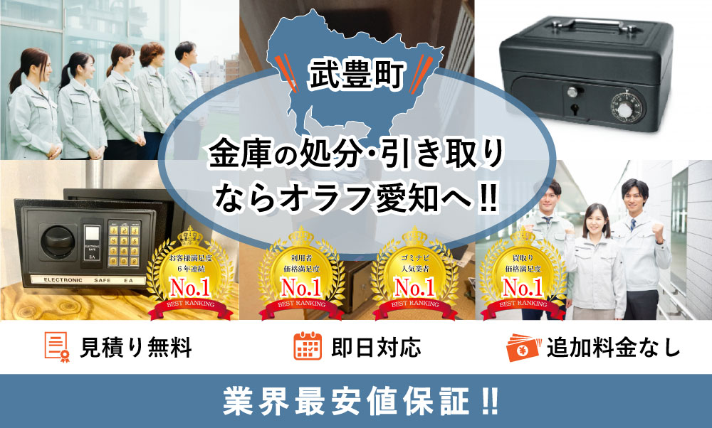 武豊町で金庫の処分ならオラフグループにお任せ下さい!地域最安値の料金で使わなくなった金庫を処分します。金庫の搬出作業は無料で対応します。重くて部屋から出せない金庫でも当社専門のプロスタッフに遠慮なくお任せ下さい!お見積もりは24時間365日無料で受付中。