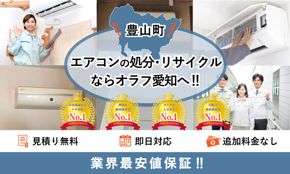 豊山町でエアコンの処分ならオラフグループにお任せ下さい!地域最安値の料金で不要になったエアコンを取外して処分します。リサイクル出来るエアコンは買取りもOK!家庭用のエアコンなら撤去工事は無料で対応します。お見積もりは24時間365日無料で受付中。
