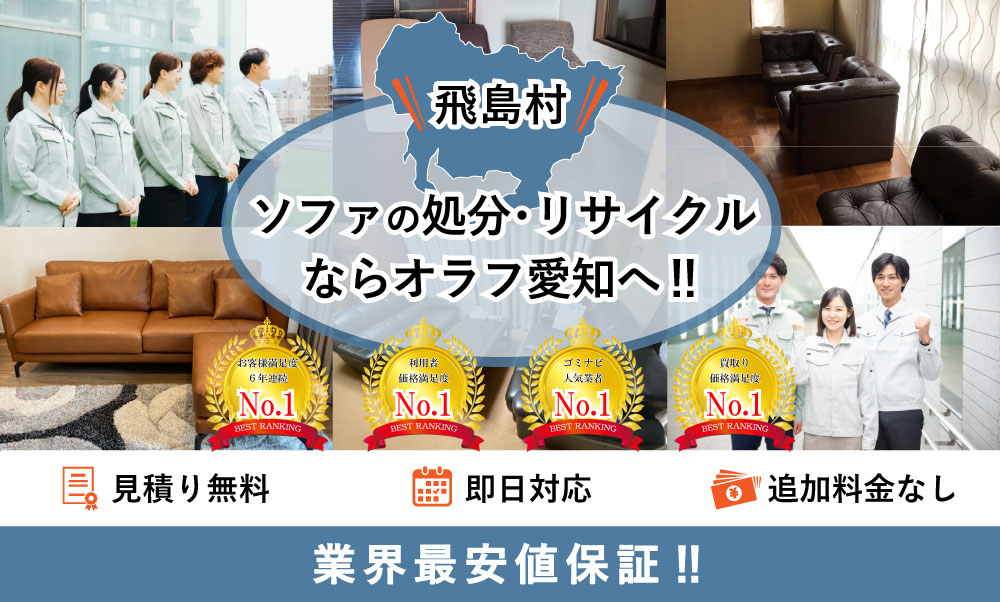 飛島村でソファの処分ならオラフグループにお任せ下さい!地域最安値の料金で不要になったソファを処分します。リサイクル出来るソファは買取りもOK!お部屋からの搬出作業は無料で対応します。お見積もりは24時間365日無料で受付中。