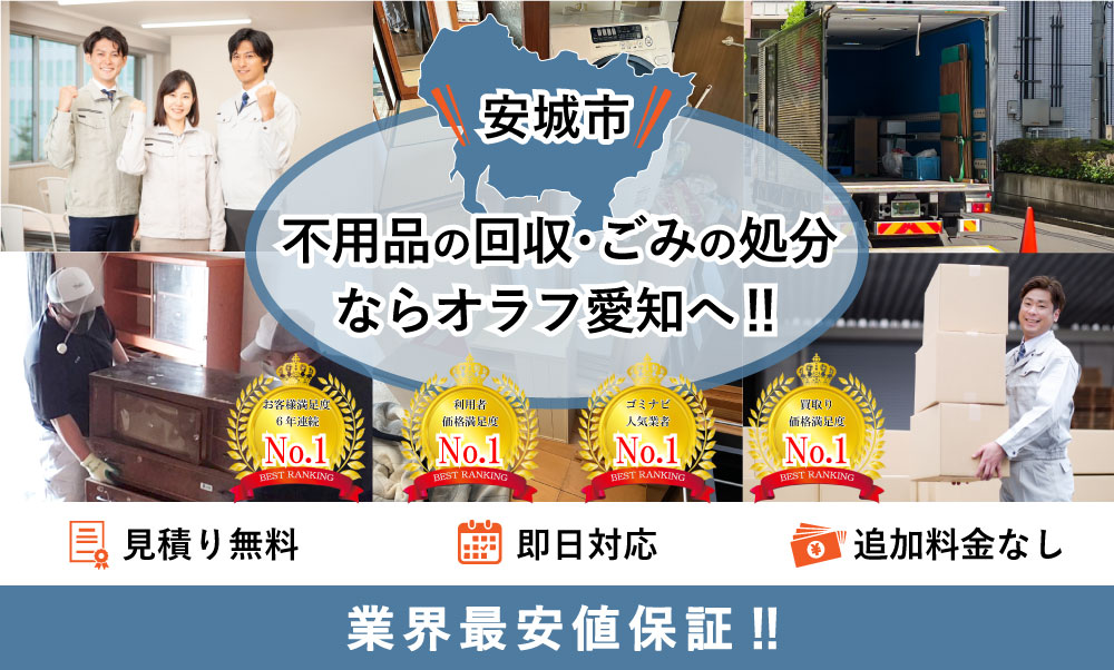 安城市で不用品回収サービスなら「早い・安い・丁寧」なオラフグループ!家具、家電、廃品、ごみ、何でも回収します。 安城市No1を目指す圧巻のサービス内容と最安値の料金で要らない不用品を即日で訪問回収します。不用品の高価買取りも実施!お見積りは24時間365日無料で受付中。
