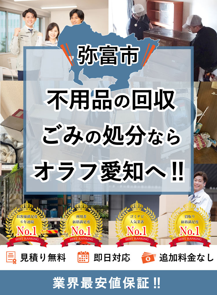 弥富市で不用品回収サービスなら「早い・安い・丁寧」なオラフグループ!家具、家電、廃品、ごみ、何でも回収します。 弥富市No1を目指す圧巻のサービス内容と最安値の料金で要らない不用品を即日で訪問回収します。不用品の高価買取りも実施!お見積りは24時間365日無料で受付中。