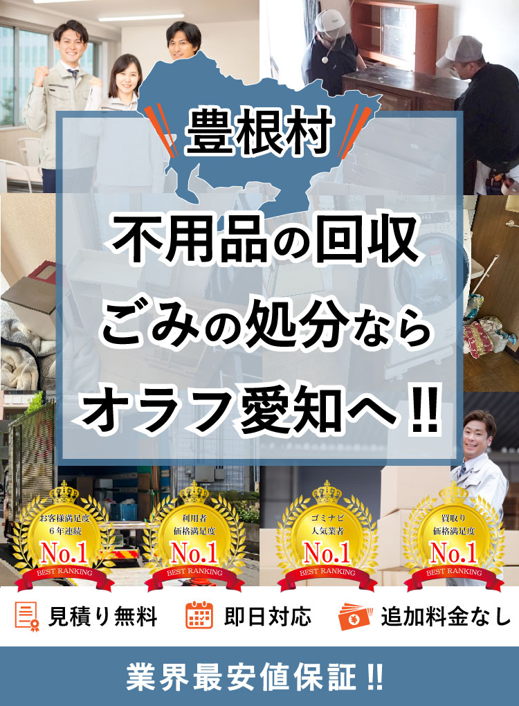 豊根村で不用品回収サービスなら「早い・安い・丁寧」なオラフグループ!家具、家電、廃品、ごみ、何でも回収します。 豊根村No1を目指す圧巻のサービス内容と最安値の料金で要らない不用品を即日で訪問回収します。不用品の高価買取りも実施!お見積りは24時間365日無料で受付中。