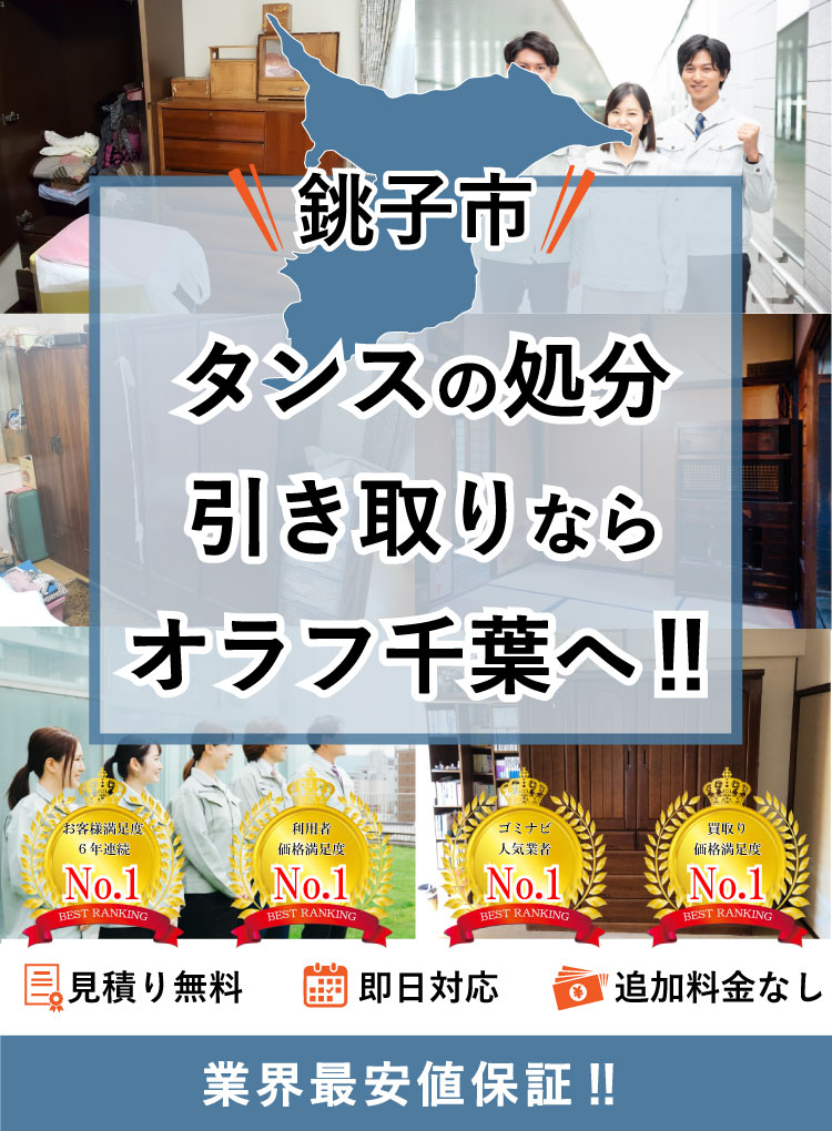 銚子市でタンスの処分ならオラフグループにお任せ下さい!地域最安値の料金で不要になったタンスを処分します。リサイクル出来るタンスは買取りもOK!タンスの搬出作業は無料で対応します。大きくて部屋から出せない婚礼タンスでも当社専門のプロスタッフに遠慮なくお任せ下さい!お見積もりは24時間365日無料で受付中。