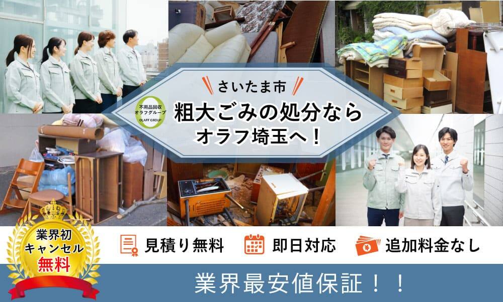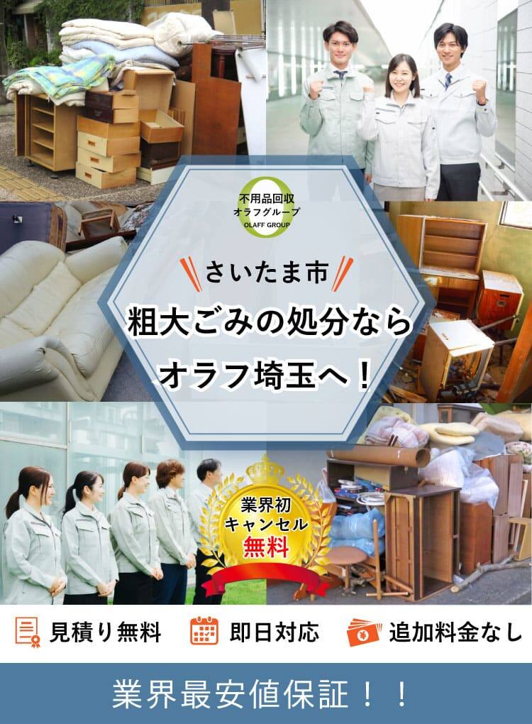 さいたま市内全域で粗大ごみの回収サービスを展開しています。365日年中無休で今日も元気に営業中!地域密着12年のベテランスタッフたちが、お困りになった不要な粗大ごみを即日対応で回収します。地域密着だからこそ出来る格安料金であなたの困ったを全力でサポートします!
