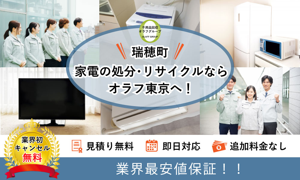 瑞穂町全域で家電・リサイクル家電の処分にお困りの方へ向けて、365日対応の家電リサイクルサービスを提供しています。回収できる家電に制限は御座いませんので冷蔵庫、テレビ、洗濯機、エアコン、など小さな小家電1点から大型のリサイクル家電までお任せください。瑞穂町最安値の料金で即日でも喜んで対応致します。