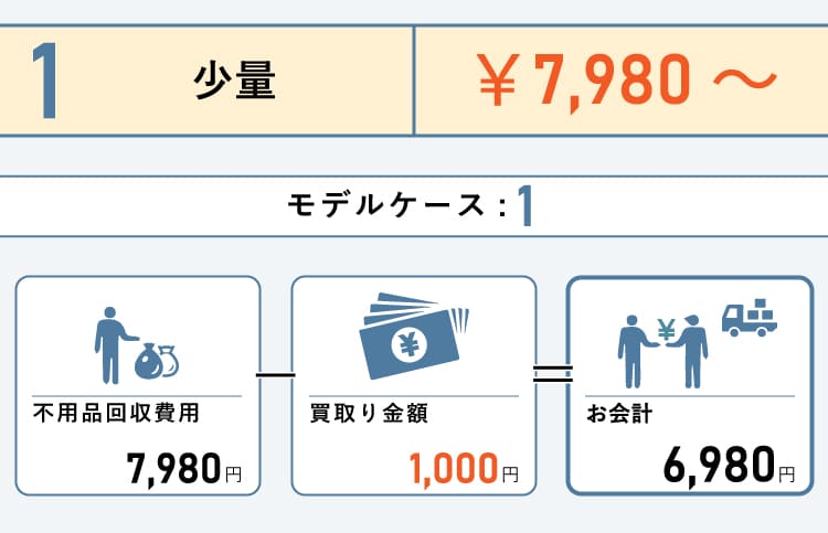 担当 山下ご相談有難う御座います。初めての方にはまず、無料相談・無料お見積りをオススメします。不用品の回収料金の決まり方にいくつかの情報が必要です。主に「物量」「内容」「住宅環境」この3つを軸にして費用が決まります。それらの条件は当社に限った事ではなく、どの業者も条件は一緒です。料金の紹介はあくまで1つの例、どちらかと言えば過去の作業事例の方が料金感覚を掴みやすいかと思います。追加料金無しのきちんとした料金をこちらから責任を持ってご提案するにはどうしても必要な事となりますので、詳しくは無料相談・無料お見積もりからまずは1度聞いてみましょう。不用品回収の業界こそ百聞は一見に如かずでございます。お手数をお掛けいたしますがご検討ください。