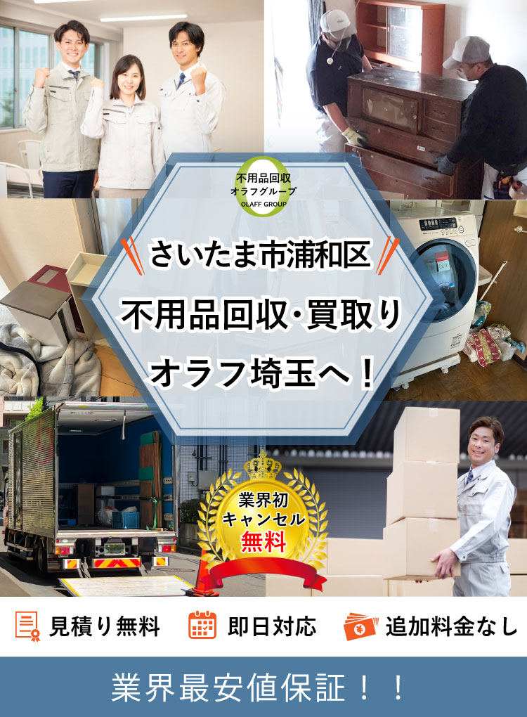 さいたま市浦和区で不用品回収サービスなら「早い・安い・丁寧」なオラフグループ!家具、家電、廃品、ごみ、何でも回収します。さいたま市浦和区No1を目指す圧巻のサービス内容と最安値の料金で要らない不用品を即日回収します。不用品の高価買取りも実施!お見積りは24時間365日無料で受付中。