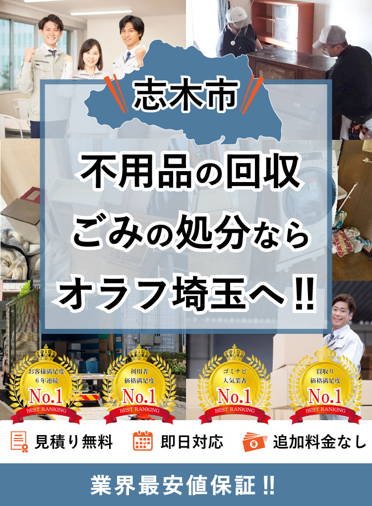 志木市で不用品回収サービスなら「早い・安い・丁寧」なオラフグループ!家具、家電、廃品、ごみ、何でも回収します。志木市No1を目指す圧巻のサービス内容と最安値の料金で要らない不用品を即日回収します。不用品の高価買取りも実施!お見積りは24時間365日無料で受付中。