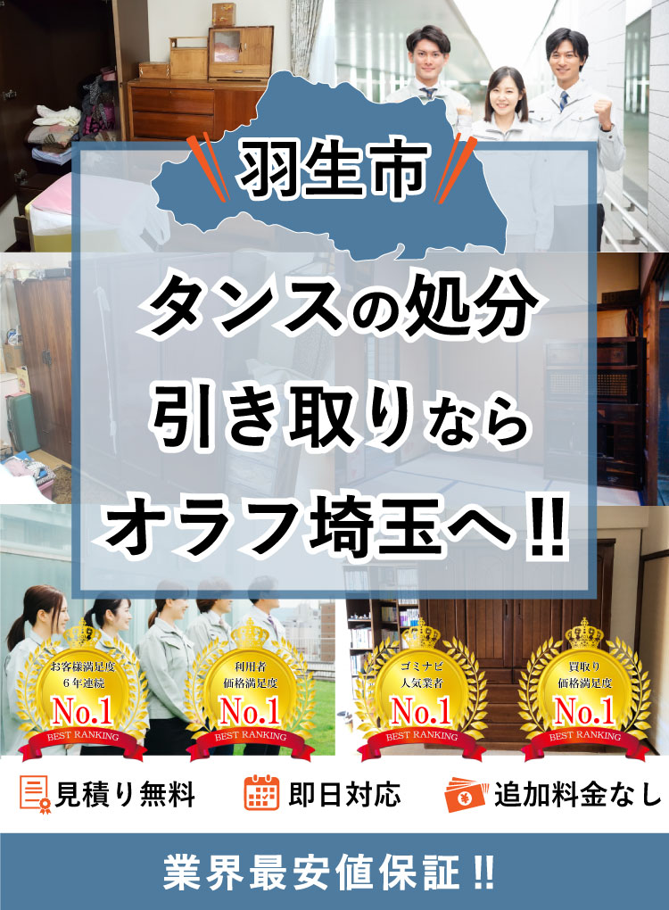 羽生市でタンスの処分ならオラフグループにお任せ下さい!地域最安値の料金で不要になったタンスを処分します。リサイクル出来るタンスは買取りもOK!タンスの搬出作業は無料で対応します。大きくて部屋から出せない婚礼タンスでも当社専門のプロスタッフに遠慮なくお任せ下さい!お見積もりは24時間365日無料で受付中。