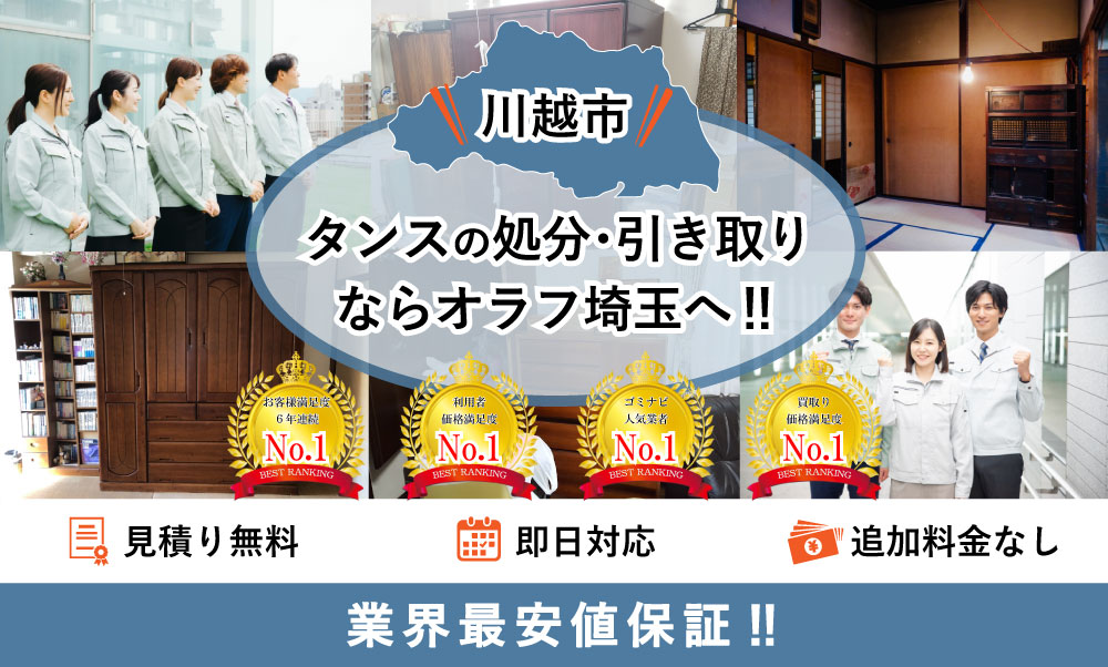 川越市でタンスの処分ならオラフグループにお任せ下さい!地域最安値の料金で不要になったタンスを処分します。リサイクル出来るタンスは買取りもOK!タンスの搬出作業は無料で対応します。大きくて部屋から出せない婚礼タンスでも当社専門のプロスタッフに遠慮なくお任せ下さい!お見積もりは24時間365日無料で受付中。