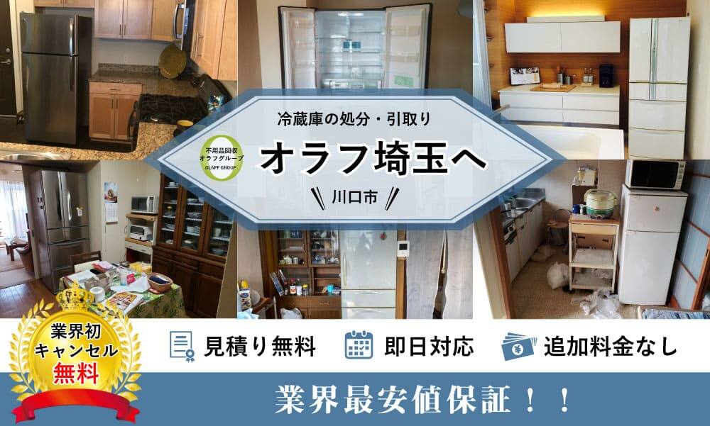 川口市で冷蔵庫の処分・リサイクル・引取りにお困りの方、地域密着の老舗12年、当社で提供する冷蔵庫の回収リサイクルサービスを利用してみませんか?小さな1枚ドアタイプ冷蔵庫から大型100kg超えの物まで何でも搬出、対応からお承り可能です。冷蔵庫の中身が入ったままでも片付けから回収の対応が可能です。新しい冷蔵庫は勿論買取り、そこそこ古くても買取りリサイクル、とても古い場合には廃棄処分、お困りの冷蔵庫の価値をプロの目線で最大限引き出しながら適切な方法でご案内します。