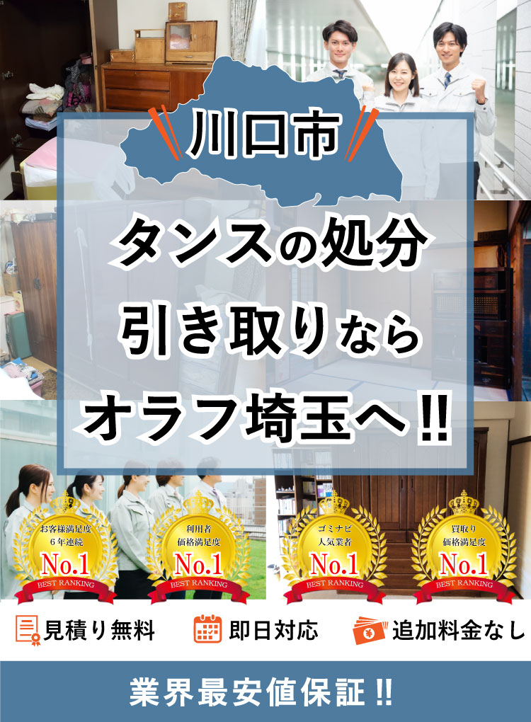 川口市でタンスの処分ならオラフグループにお任せ下さい!地域最安値の料金で不要になったタンスを処分します。リサイクル出来るタンスは買取りもOK!タンスの搬出作業は無料で対応します。大きくて部屋から出せない婚礼タンスでも当社専門のプロスタッフに遠慮なくお任せ下さい!お見積もりは24時間365日無料で受付中。