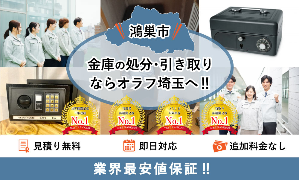 鴻巣市で金庫の処分ならオラフグループにお任せ下さい!地域最安値の料金で使わなくなった金庫を処分します。家庭用金庫の搬出作業は無料で対応します。重くて部屋から出せない金庫でも当社専門のプロスタッフが搬出作業を行いますので遠慮なくお任せ下さい!お見積もりは24時間365日無料で受付中。