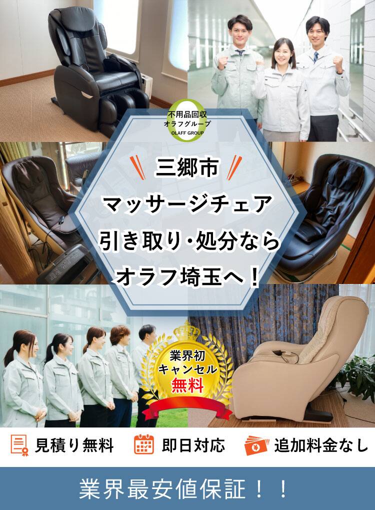 三郷市でマッサージチェアの処分にお困りの方、当社で提供しているマッサージチェアの訪問回収サービスのご案内です。要らなくなったマッサージチェアをお好きな日時にご自宅までお伺いして引取り処分します。
