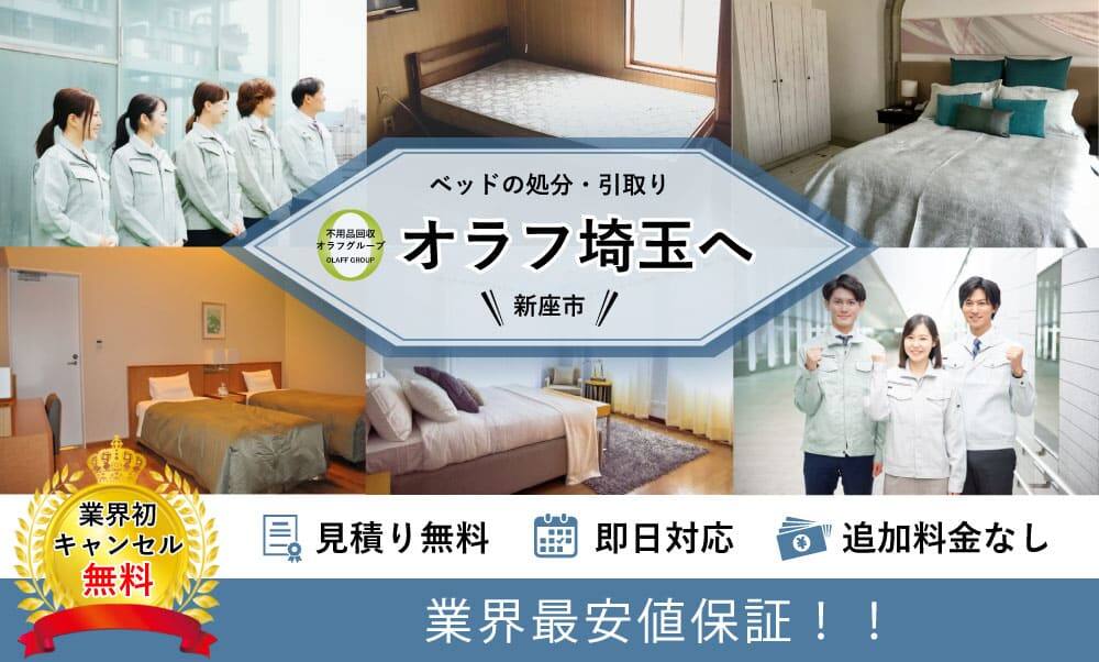 新座市でベッドの処分を検討中の方、地域密着12年のベッド回収のプロフェッショナルオラフグループへご相談下さい。価値があるベッドは買取り、価値が無いけどまだまだ使えるベッドは海外でリサイクル、その他ベッドの処分でも何でも対応可能です。ベッドの訪問回収サービスでは、必要な工具や資材、全ての事をお任せして依頼できる丸投げプランでご案内しておりますので、お客様は見ているだけでOKの安心パックです。