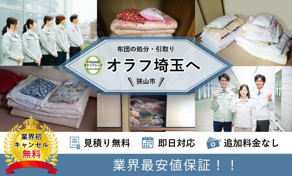 狭山市で布団の処分にお困りの方は当社までご相談下さい!地域最安値の料金で、迅速、丁寧にお好きな日時で回収します。1枚からでもお伺い出来ますのでお引越しにも最適!勿論押し入れ一杯の大量でも引き取り出来ますので、不用品回収や遺品整理の場合でも何でもご相談下さい。