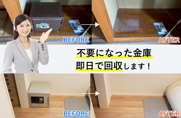 当社の金庫回収サービスでは、お客様の好きな時、好きな時間、好きなタイミングでご予約を入れられますので忙しい方でも安心してご利用いただけます。まだまだ使える金庫は海外への輸出によるリサイクルもおこなっていますので、通常処分になるよりも格安の料金で引き取り出来ます。引っ越しシーズンなどの繁忙期には1カ月待ちのサービスとなりますのでご予約はお早めにどうぞ!