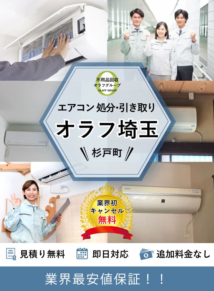 杉戸町でエアコンの取り外し、処分、リサイクルなら当社にお任せください。お困りのエアコンを最短即日対応で取り外し、回収します。リサイクルショップを運営する当社ではエアコンの買取りに強く、外したエアコンを査定してリサイクル、処分、買取りと色々なご提案をする事が可能です。家庭用のエアコンであれば、窓枠ウィンドウエアコン、天吊り室外機、200ボルトエアコン何でも対応致します。