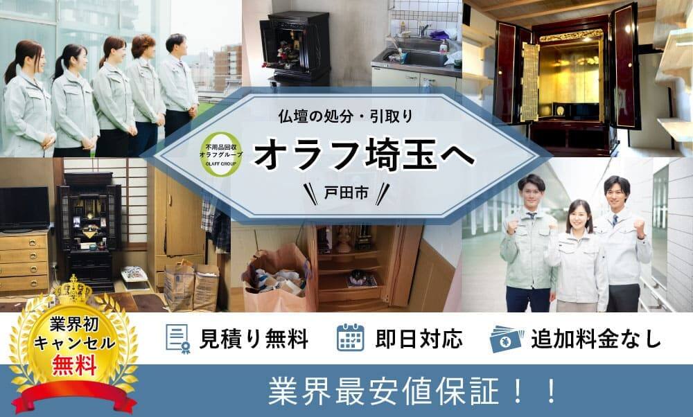 戸田市でお仏壇の処分にお困りの方へ向けて、回収引取りのサービスを提供しています。お電話1本でお見積もりから引取り作業まで簡単にご依頼可能です。お見積もりだけでも大歓迎。お仏壇じまいの方法に悩む前に不安な事はプロに無料で聞いてみましょう。