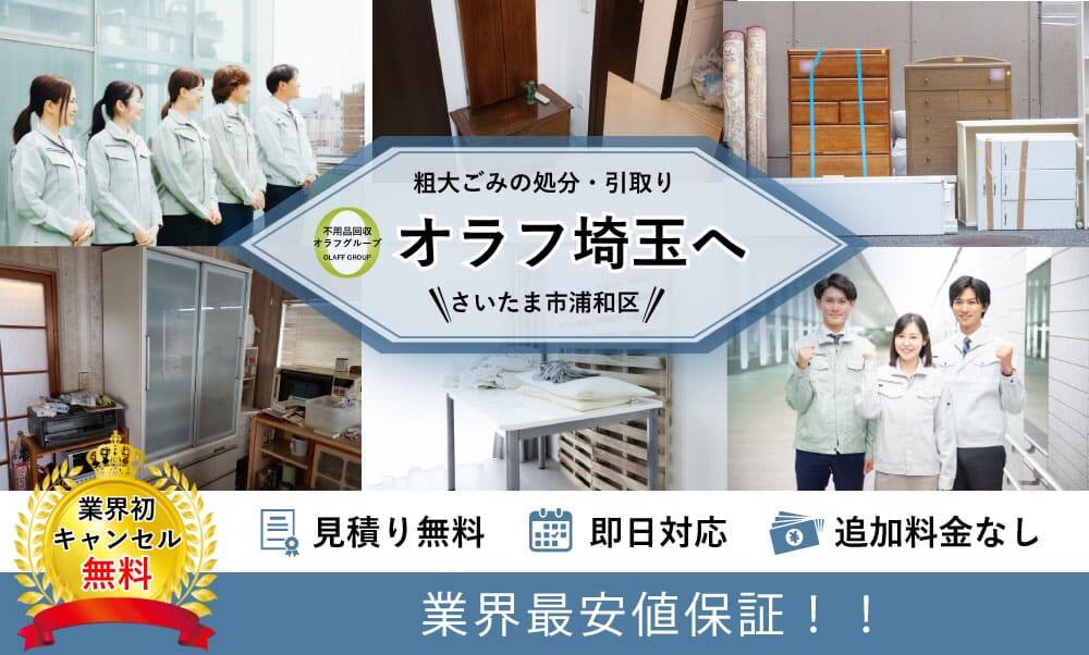 さいたま市浦和区で粗大ごみの引取り処分なら当社へお任せください。粗大ごみなら大きさ、種類、関係なく何でも回収します。家具、家電の制限も御座いませんのでタンス、食器棚などの大型品から扇風機、レンジなどお困りの物を何でも引取りいたします。1点〜1軒丸ごと対応出来ますので、ご興味がある方はまずは無料相談、無料お見積りからお気軽にご相談下さい。