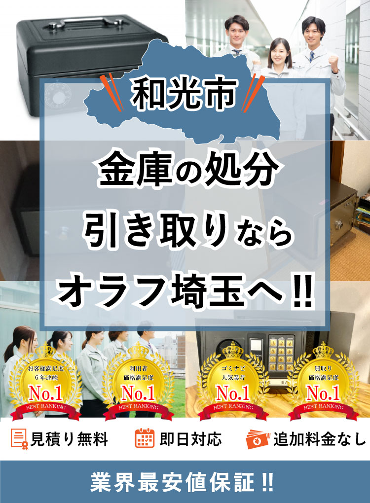 和光市で金庫の処分ならオラフグループにお任せ下さい!地域最安値の料金で使わなくなった金庫を処分します。家庭用金庫の搬出作業は無料で対応します。重くて部屋から出せない金庫でも当社専門のプロスタッフが搬出作業を行いますので遠慮なくお任せ下さい!お見積もりは24時間365日無料で受付中。