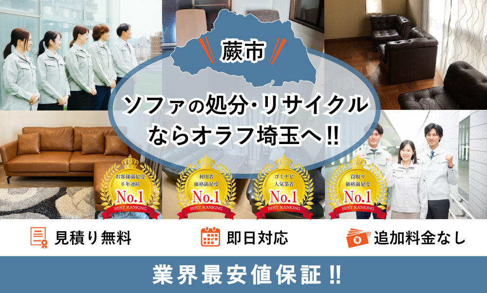 蕨市でソファの処分ならオラフグループにお任せ下さい!地域最安値の料金で不要になったソファを処分します。リサイクル出来るソファは買取りもOK!お部屋からの搬出作業は無料で対応します。お見積もりは24時間365日無料で受付中。