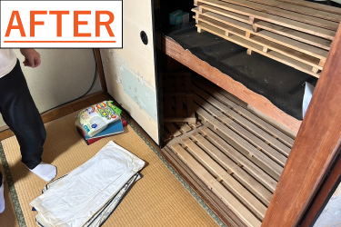 押し入れに丁寧に収納されていた布団を取り出し、回収しました。布団は状態が良く、長年大切にされていたことが伝わってきました。すべてを搬出したあとの押し入れはすっきりとし、空間に余白が生まれました。お客様からも「安心して任せられた」と嬉しいお言葉をいただきました。
