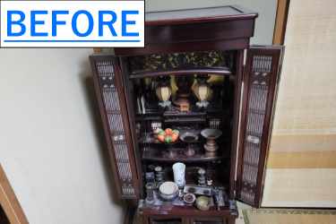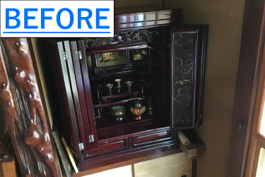 近年では良く見かけるようになりました小さなタイプの仏壇。台の上や棚の上などに載せて使う小さいタイプの物です。通常の粗大ごみ、あるいは自分で壊して捨てる事も可能ですが、仏壇の性質上供養を検討される方も少なくありません。