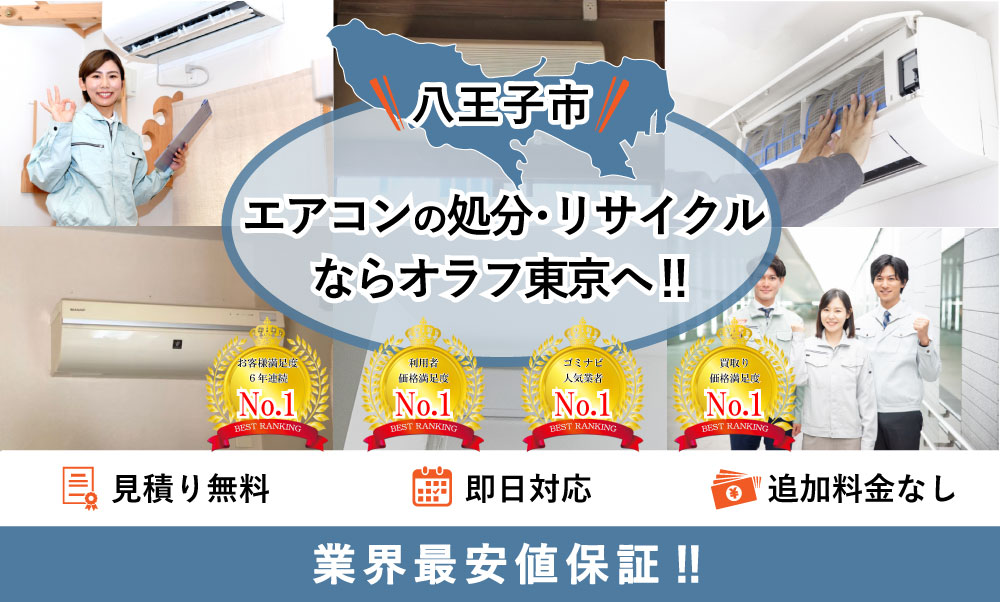 八王子市でエアコンの処分ならオラフグループにお任せ下さい!地域最安値の料金で不要になったエアコンを取外して処分します。リサイクル出来るエアコンは買取りもOK!家庭用のエアコンなら撤去工事は無料で対応します。お見積もりは24時間365日無料で受付中。