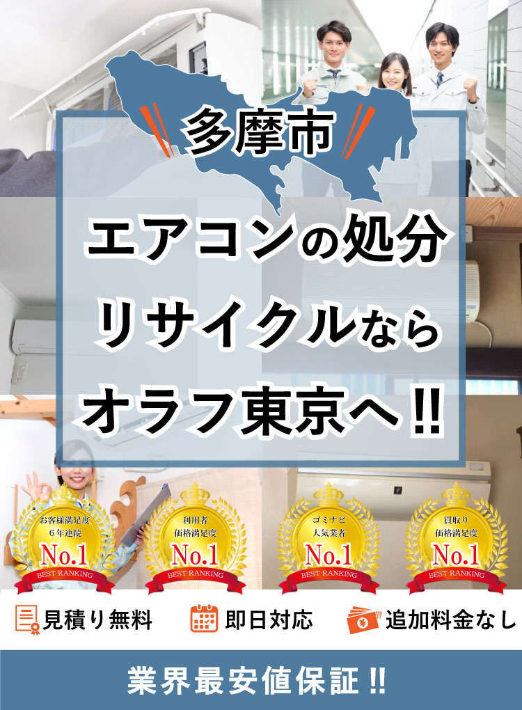多摩市でエアコンの処分ならオラフグループにお任せ下さい!地域最安値の料金で不要になったエアコンを取外して処分します。リサイクル出来るエアコンは買取りもOK!家庭用のエアコンなら撤去工事は無料で対応します。お見積もりは24時間365日無料で受付中。