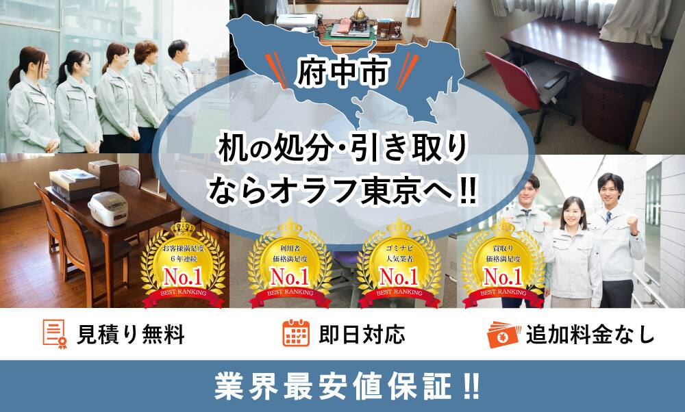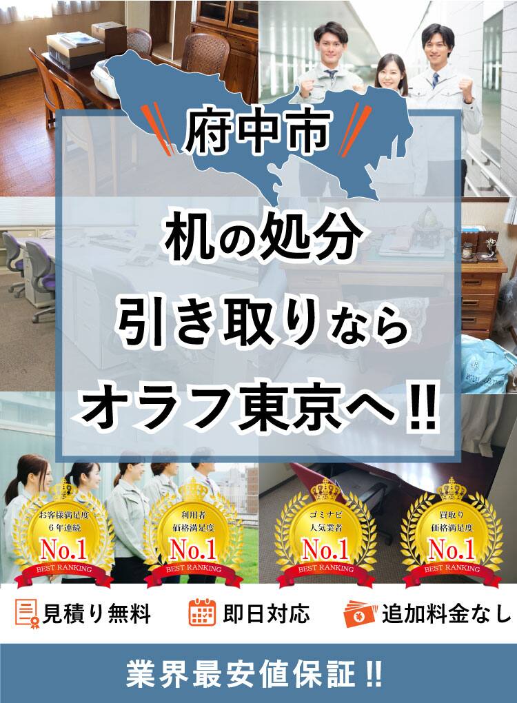 府中市で机の処分ならオラフグループにお任せ下さい!地域最安値の料金で不要になった机を処分します。リサイクル出来る机は買取りもOK!机の搬出作業は無料で対応します。大きくて部屋から出せない学習デスクでも当社専門のプロスタッフに遠慮なくお任せ下さい!お見積もりは24時間365日無料で受付中。