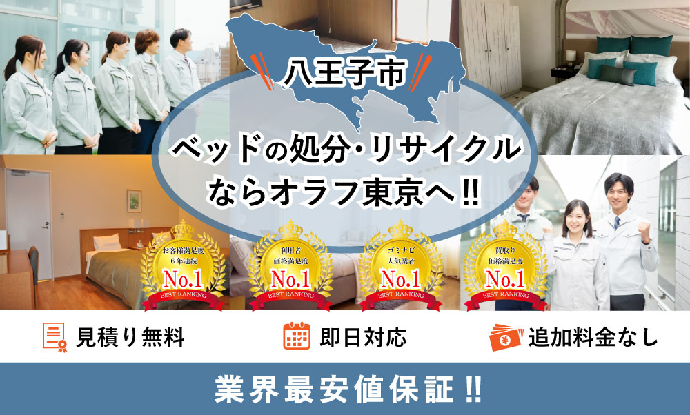 八王子市でベッド・スプリングマットレスの処分にお困りの方へ向けて当社で提供するベッド訪問回収サービスのご案内です。ご希望の日時に当社のスタッフがご自宅まで訪問し、家の中に置いてある要らなくなったベッド・マットレスを解体して搬出し、回収して処分いたします。八王子市内であれば即日でのベッド回収も対応させて頂きます。