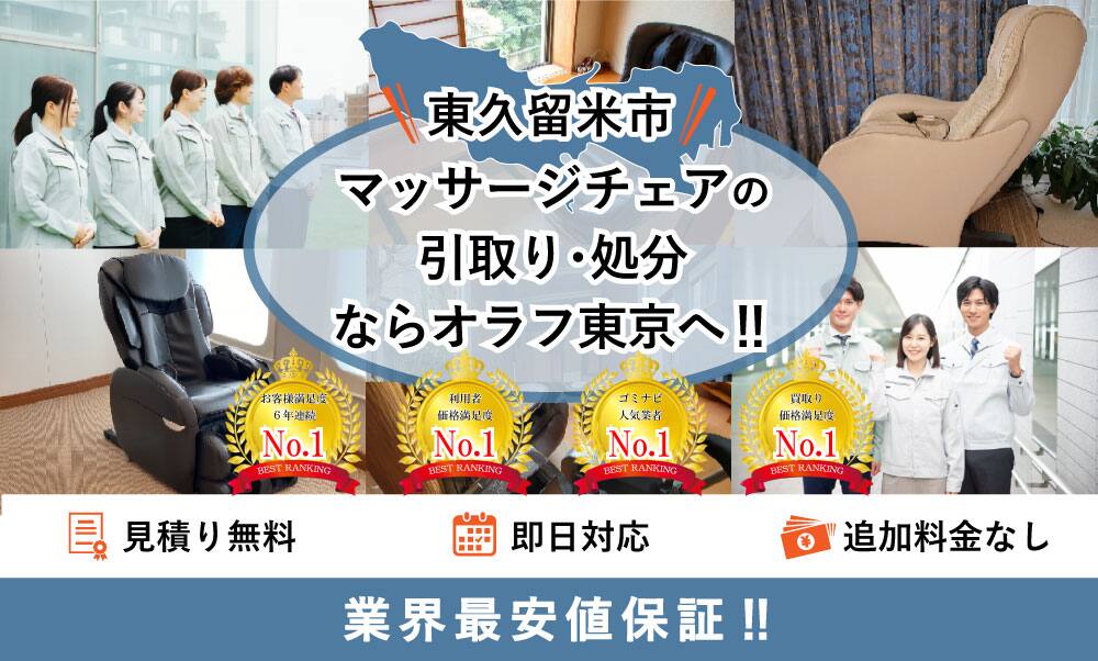 東久留米市でマッサージチェアの処分ならオラフグループにお任せ下さい!地域最安値の料金で使わなくなったマッサージチェアを処分します。マッサージチェアの搬出作業は無料で対応します。重くて部屋から出せないマッサージチェアでも当社専門のプロスタッフに遠慮なくお任せ下さい!お見積もりは24時間365日無料で受付中。