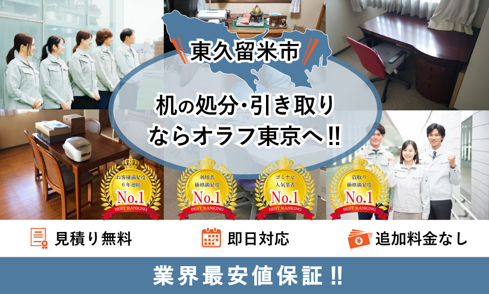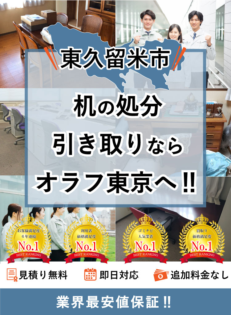 東久留米市で机の処分ならオラフグループにお任せ下さい!地域最安値の料金で不要になった机を処分します。リサイクル出来る机は買取りもOK!机の搬出作業は無料で対応します。大きくて部屋から出せない学習デスクでも当社専門のプロスタッフに遠慮なくお任せ下さい!お見積もりは24時間365日無料で受付中。