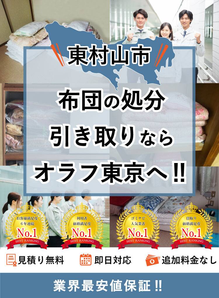 東村山市で布団の処分にお困りの方は当社までご相談下さい!地域最安値の料金で、迅速、丁寧にお好きな日時で回収します。1枚からでもお伺い出来ますのでお引越しにも最適!勿論押し入れ一杯の大量でも引き取り出来ますので、不用品回収や遺品整理の場合でも何でもご相談下さい。