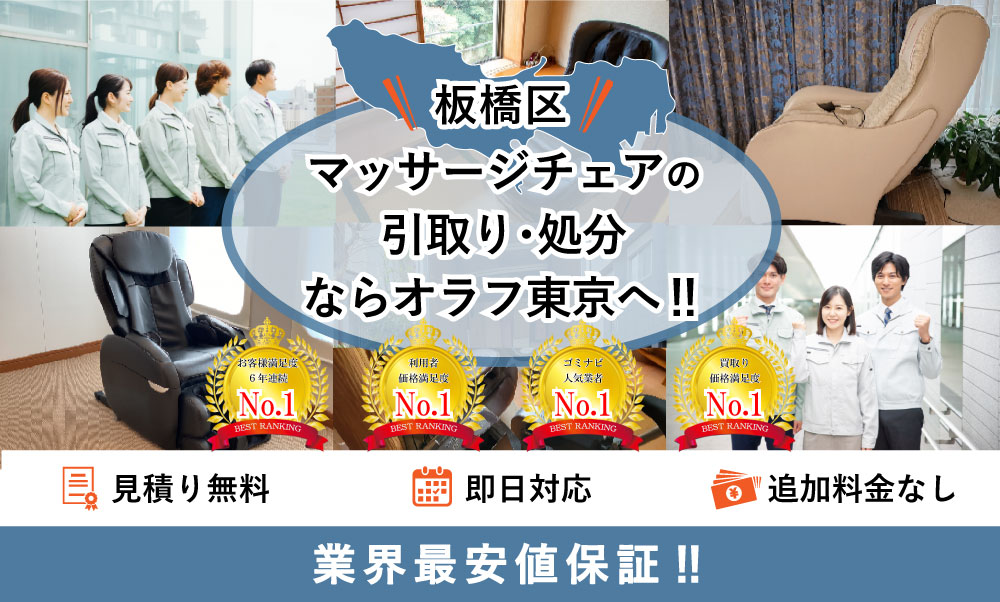 板橋区でマッサージチェアの処分ならオラフグループにお任せ下さい!地域最安値の料金で使わなくなったマッサージチェアを処分します。マッサージチェアの搬出作業は無料で対応します。重くて部屋から出せないマッサージチェアでも当社専門のプロスタッフに遠慮なくお任せ下さい!お見積もりは24時間365日無料で受付中。