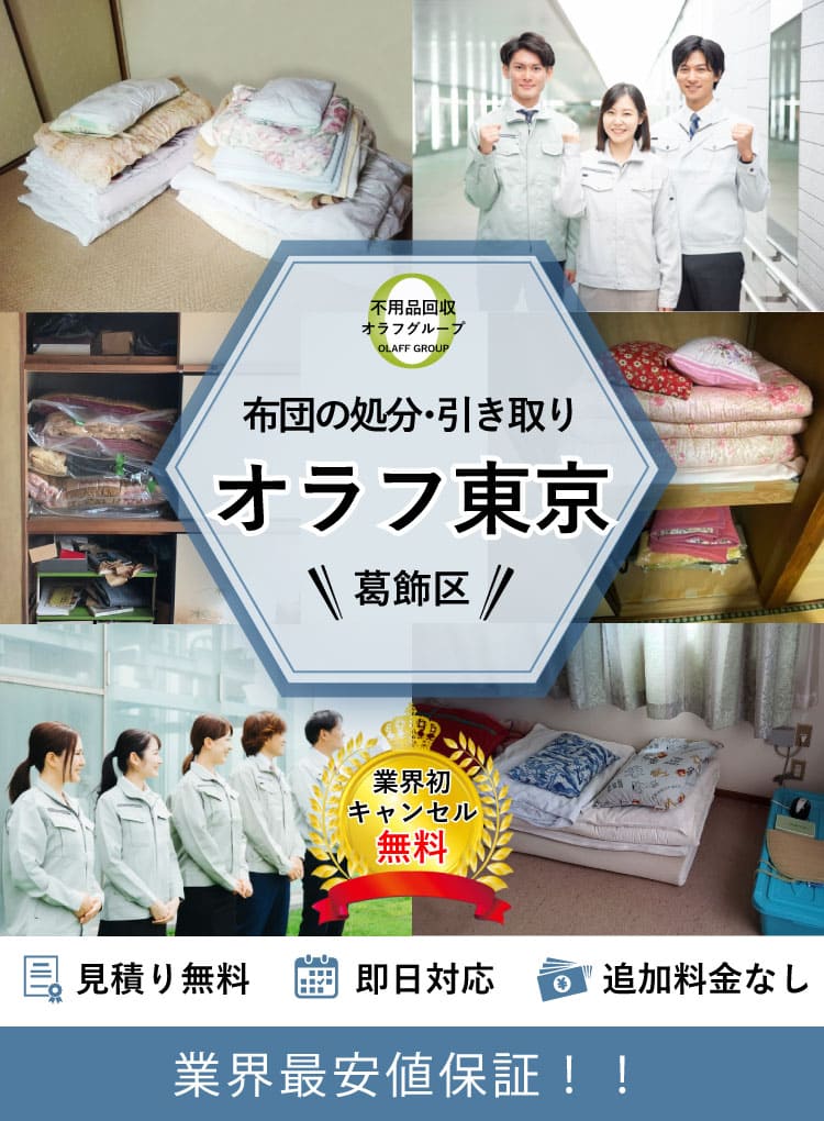 葛飾区で布団の処分にお困りの方は当社までご相談下さい!地域最安値の料金で、迅速、丁寧にお好きな日時で回収します。1枚からでもお伺い出来ますのでお引越しにも最適!勿論押し入れ一杯の大量でも引き取り出来ますので、不用品回収や遺品整理の場合でも何でもご相談下さい。