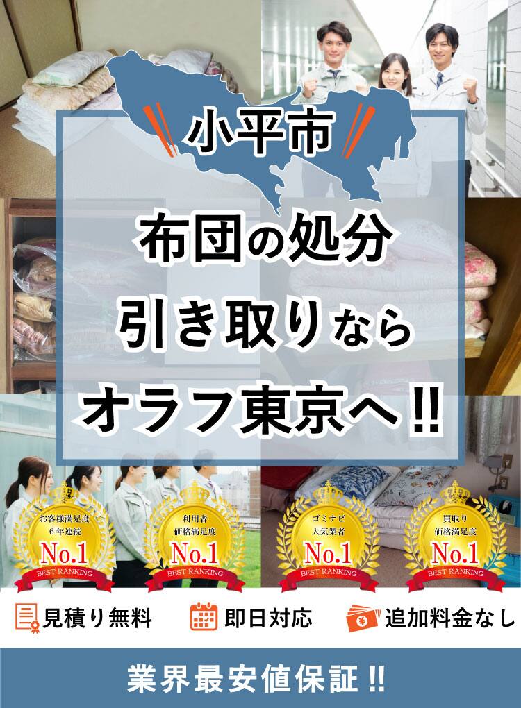 小平市で布団の処分にお困りの方は当社までご相談下さい!地域最安値の料金で、迅速、丁寧にお好きな日時で回収します。1枚からでもお伺い出来ますのでお引越しにも最適!勿論押し入れ一杯の大量でも引き取り出来ますので、不用品回収や遺品整理の場合でも何でもご相談下さい。