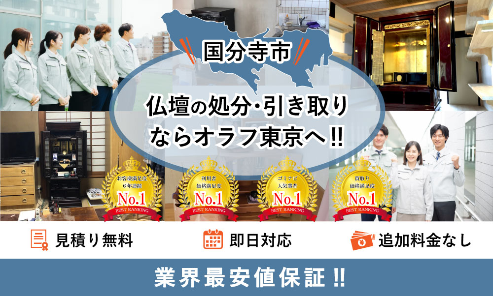 国分寺市でお仏壇の処分ならオラフグループにお任せ下さい!地域最安値の料金で不要になったお仏壇を供養・処分致します。供養の有無や種類はご予算に合わせてお選びいただけます。お部屋からお仏壇の搬出作業は当社のスタッフが無料で対応します。お見積もりは24時間365日無料で受付中。