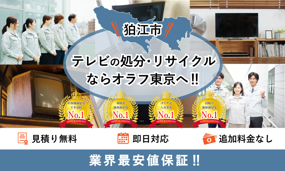 東京都狛江市でテレビの処分ならオラフグループにお任せ下さい!地域最安値の料金で不要になったテレビを処分します。リサイクル出来るテレビは買取りもOK!お部屋からの搬出作業は無料で対応します。お見積もりは24時間365日無料で受付中。