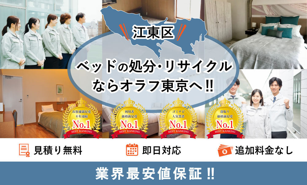 江東区でベッド・マットレスの処分ならオラフグループにお任せ下さい!地域最安値の料金で不要になったベッド・マットレスを処分します。リサイクル出来るベッドは買取りもOK!お部屋からの搬出作業は無料で対応します。お見積もりは24時間365日無料で受付中。